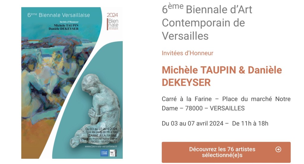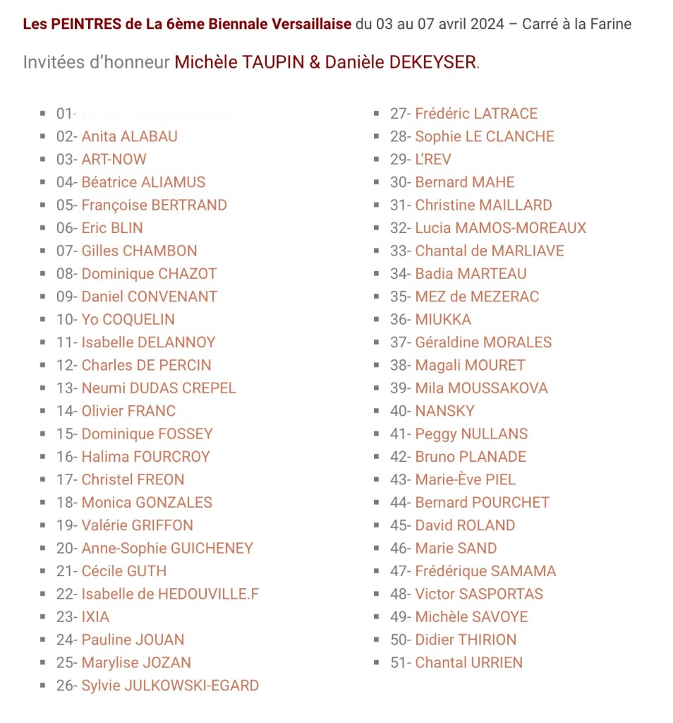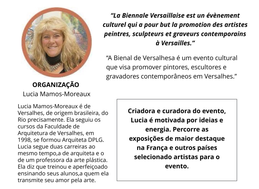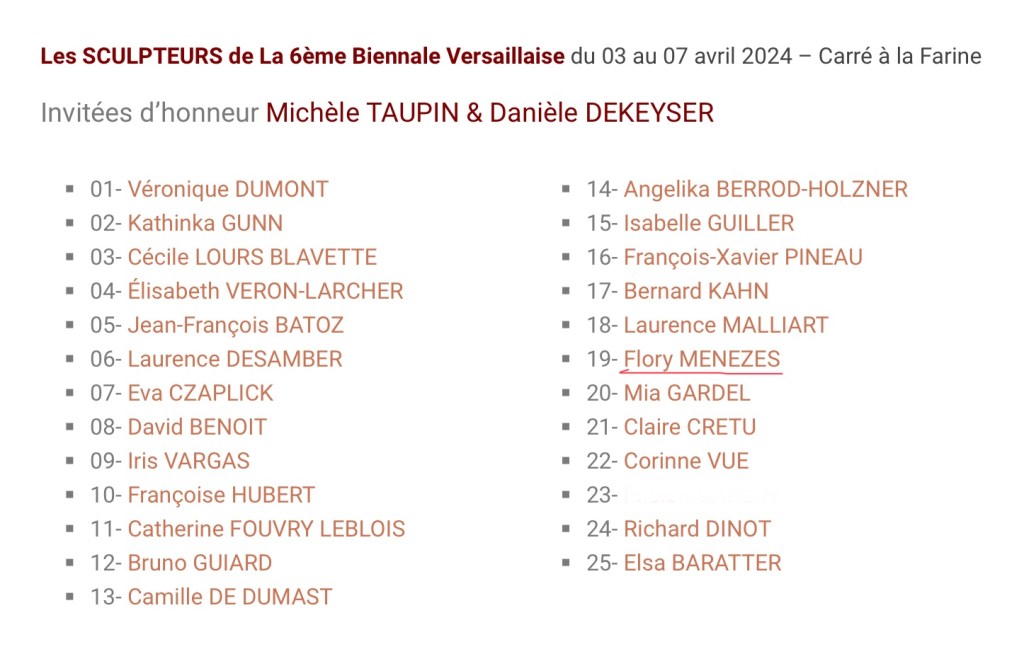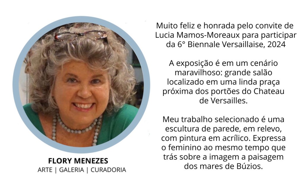 Bienal, exposição 6° BIENNALE VERSAILLAISE | participação Flory Menezes Data: 24 24+00:00 março 24+00:00 2024Autor: arteinterativabuzios 0 Comentários de 3 à 7 de abril 2024, na Galerie du Carré à la Farine, em Versailles, França FLORY MENEZES “Os lençóis de minha cama” – escultura em relevo | fibra de vidro | pintura em acrílico | 90cm 75cm Artistas participantes: Organização: Local: Galerie du Carré à la Farine, em Versailles, França Compartilhe isso: Clique para compartilhar no X(abre em nova janela) 18+ Clique para compartilhar no Facebook(abre em nova janela) Facebook Curtir Carregando...