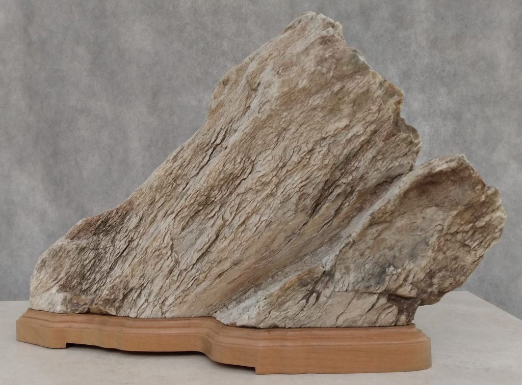 No caso específico desta peça exposta, o suiseki representa a beleza colossal da nossa costa rochosa, um registro geológico de movimentos tectônicos que dividiram o antigo continente Gondwana, dando origem aos continentes americano e africano, e também ao oceano Atlântico, há cerca de 100 milhões de anos. A daiza é feita em imbuia, e a mesa é feita em itaúba.