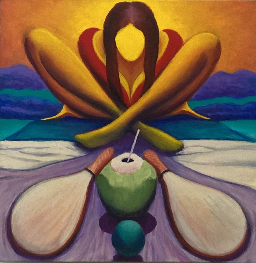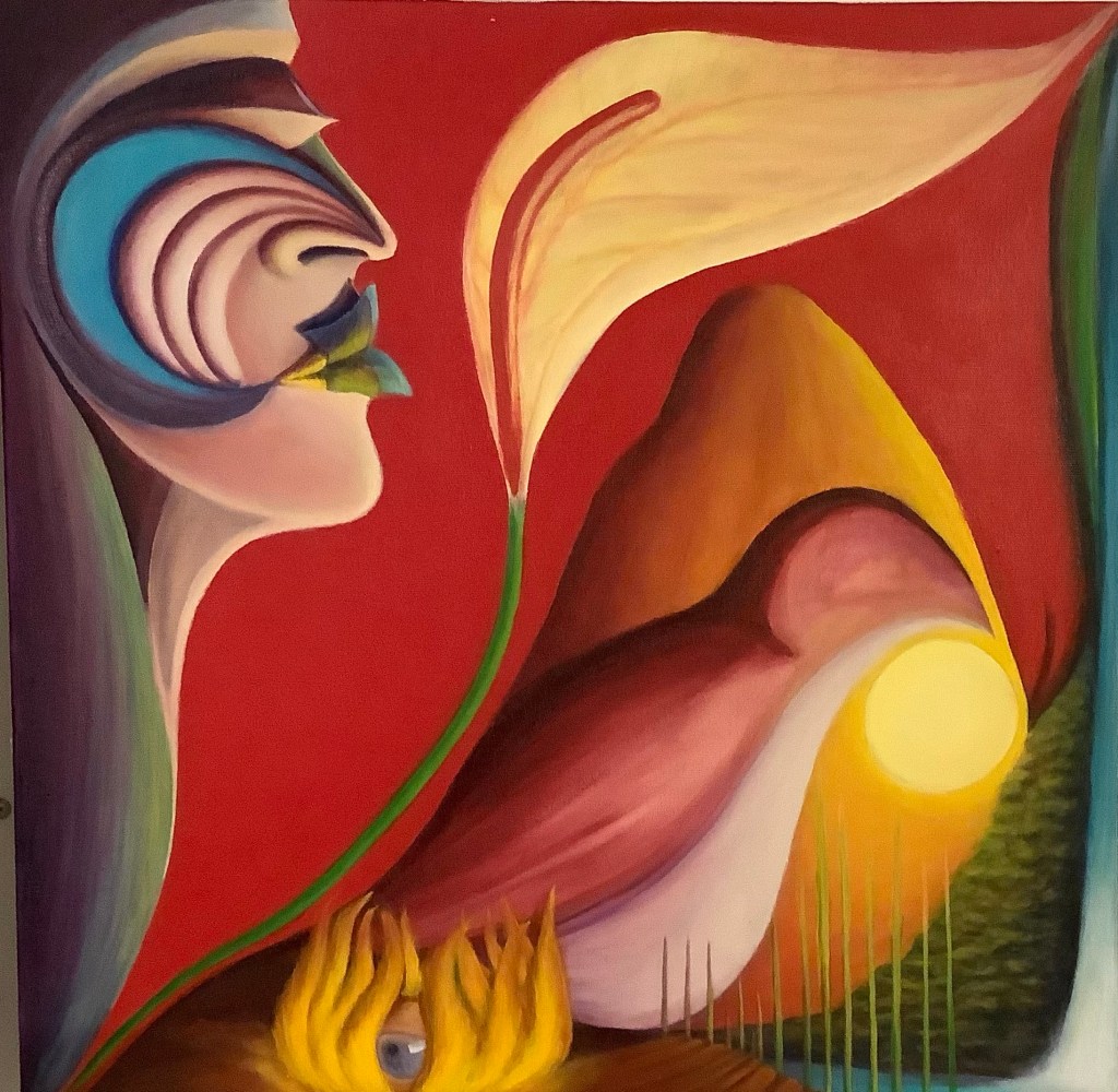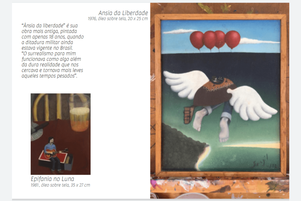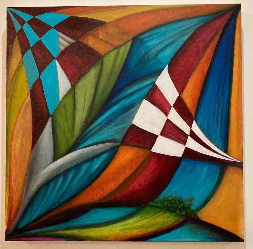 Conversam em minhas telas com grande naturalidade, o grafismo dos personagens que teimavam em invadir de trás para a frente os meus cadernos da escolae as manchas pictőricas que me fazem viajar lá no alto do cếu do Rio, minha querida cidade natal e famoso caldeirão cultural onde tudo se mistura.